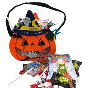 Bolsa Calabaza Halloween Rellena de Chuches Surtidas | Chuches Halloween | Calabaza + 250 gramos de Golosinas y Chuches para Halloween Truco o Trato – Bolsa de Fieltro [IAMI]