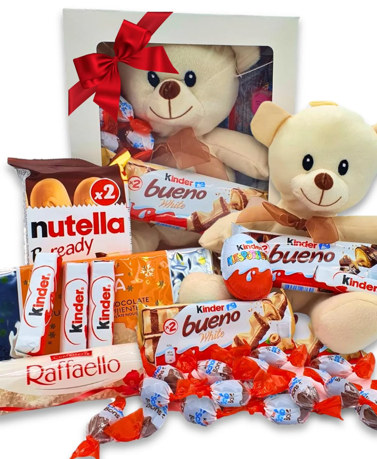Caja Regalo de Chocolates KINDER, NUTELLA y RAFFAELLO que vienen acompañadas con un precioso OSITO de PELUCHE BLANCO. Las mejores marcas de chocolates del mercado en esta espectacular caja de regalo que cuenta con un toque amoroso. Todo ello presentado en una caja premium de color blanco con ventana trasparente para que la persona que reciba el regalo quede entusiasmada.