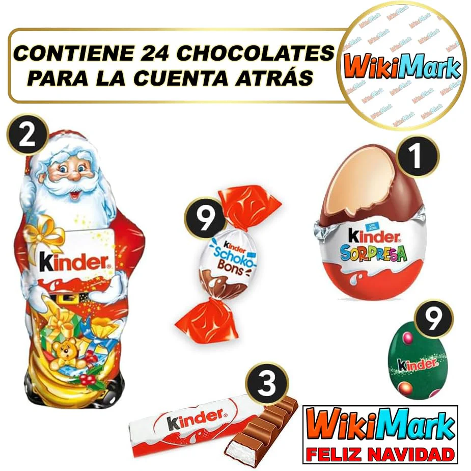 - ????????【Incluye Felicitación Navideña de WikiMark】Regala nuestro calendario adviento esta navidad. Contiene 24 bombones y chocolates, Huevo Kinder Sorpresa, Kinder Chocolate, Kinder SchokoBons, Huevos kinder y más sabores, haciendo que cada día sea una deliciosa sorpresa. Compártelo con tu Familia y Amigos.