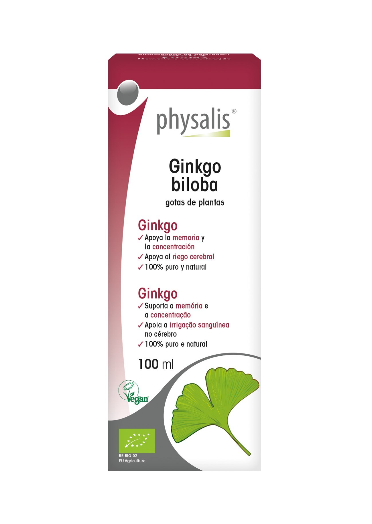Physalis Ginkgo biloba gotas de plantas bio apoyan al riego cerebral y mantienen así la memoria. Los principios activos presentes en las hojas de ginkgo constituyen un complemento apropiado para todos aquellos en los que la memoria necesita ser estimulada (personas mayores, estudiantes,…).
