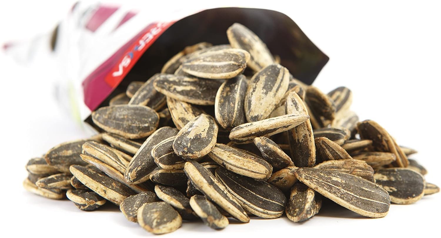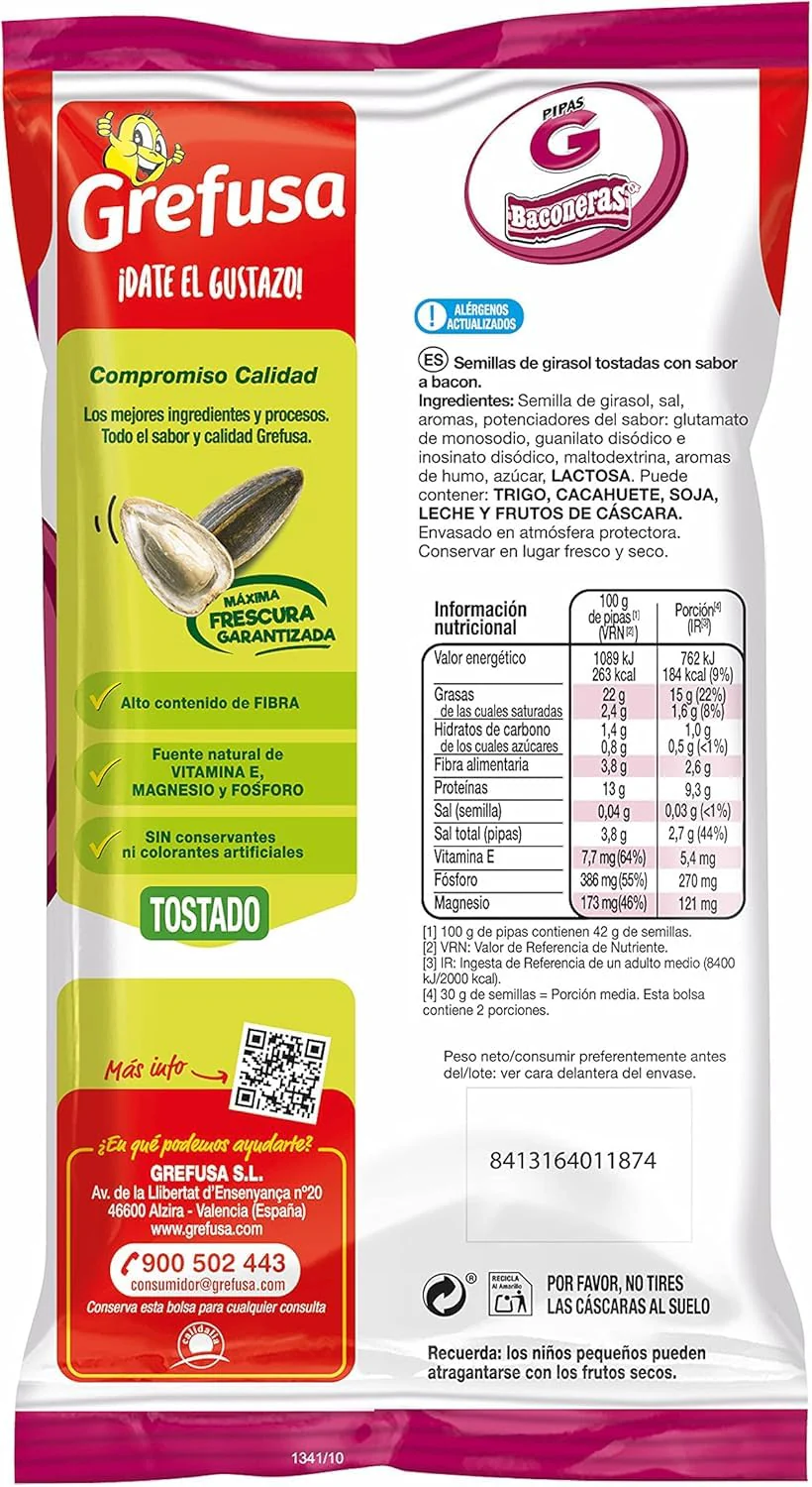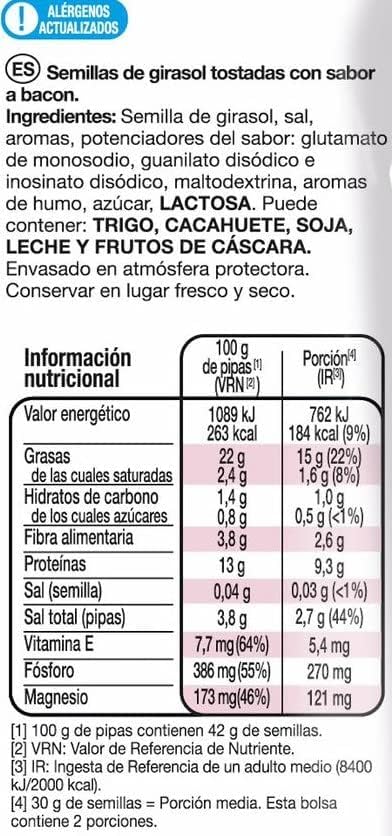 Las semillas de girasol tostadas con sabor a bac?n de Grefusa es un producto tostado. Es una fuente natural de vitamina e, magnesio y f?sforo y tiene un alto contenido de fibra. Fue elaborado sin conservantes ni colorantes artificiales. Tiene una textura crujiente y se envasa en una atm?sfera protectora para mantener la frescura durante m?s tiempo.