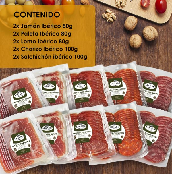 - [CONTENIDO]: 2 x Jamon Iberico 80 gr, 2 x Paleta Iberica 80 gr, 2 x Lomo Iberico 80 gr, 2 x Chorizo Iberico 100 gr, 2 x Salchichon Iberico 100 gr. 10 Sobres de Embutidos Ibericos. Total 100 gr.