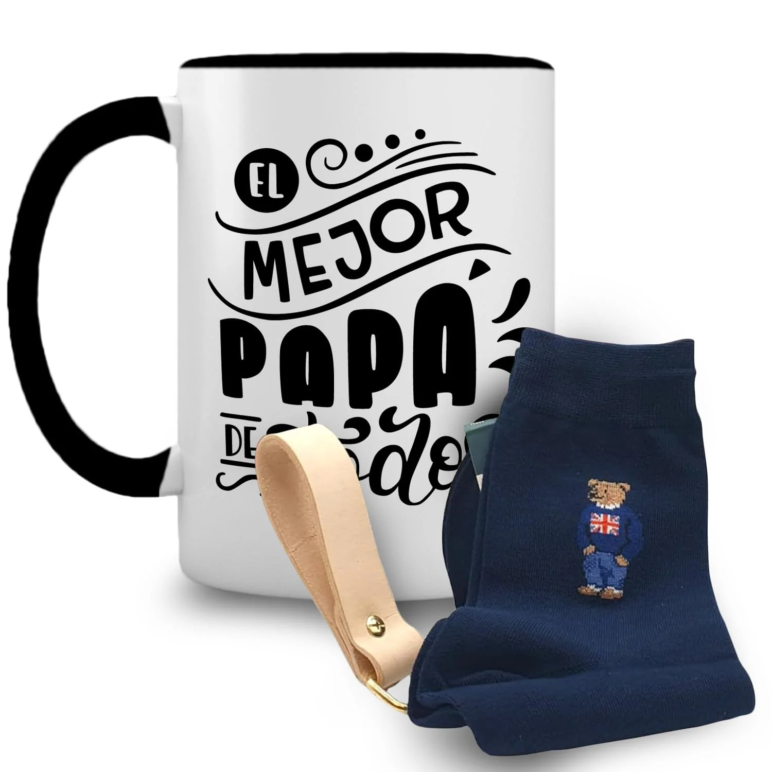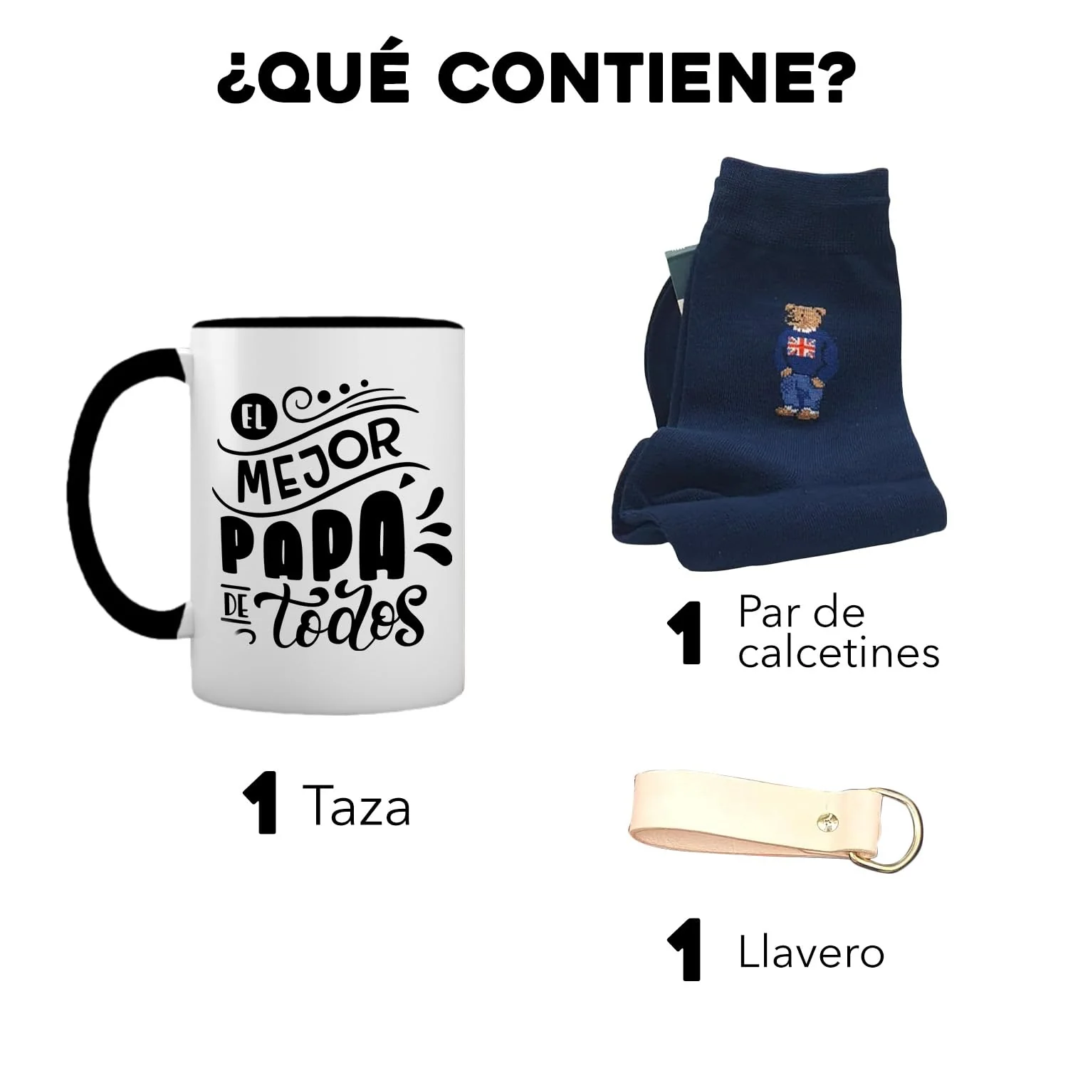 ¡Sorprende a papá en su día con este pack regalo! Incluye una taza que lo hará sentir el mejor papá de todos, un llavero para llevar siempre consigo y unos calcetines que le darán un toque divertido a sus días. ¡Haz que se sienta especial con este regalo único!