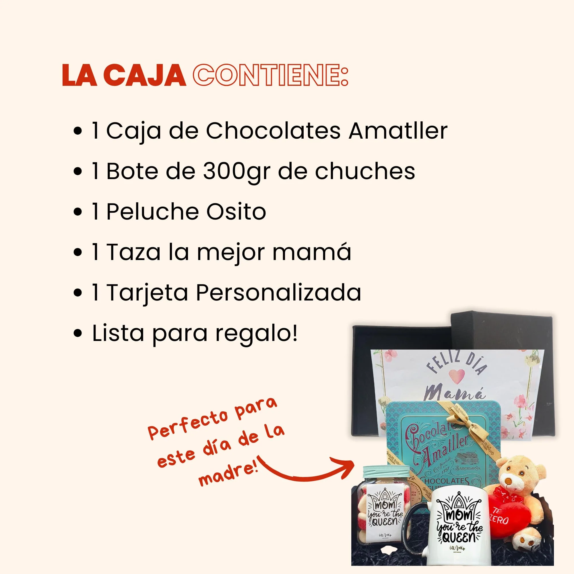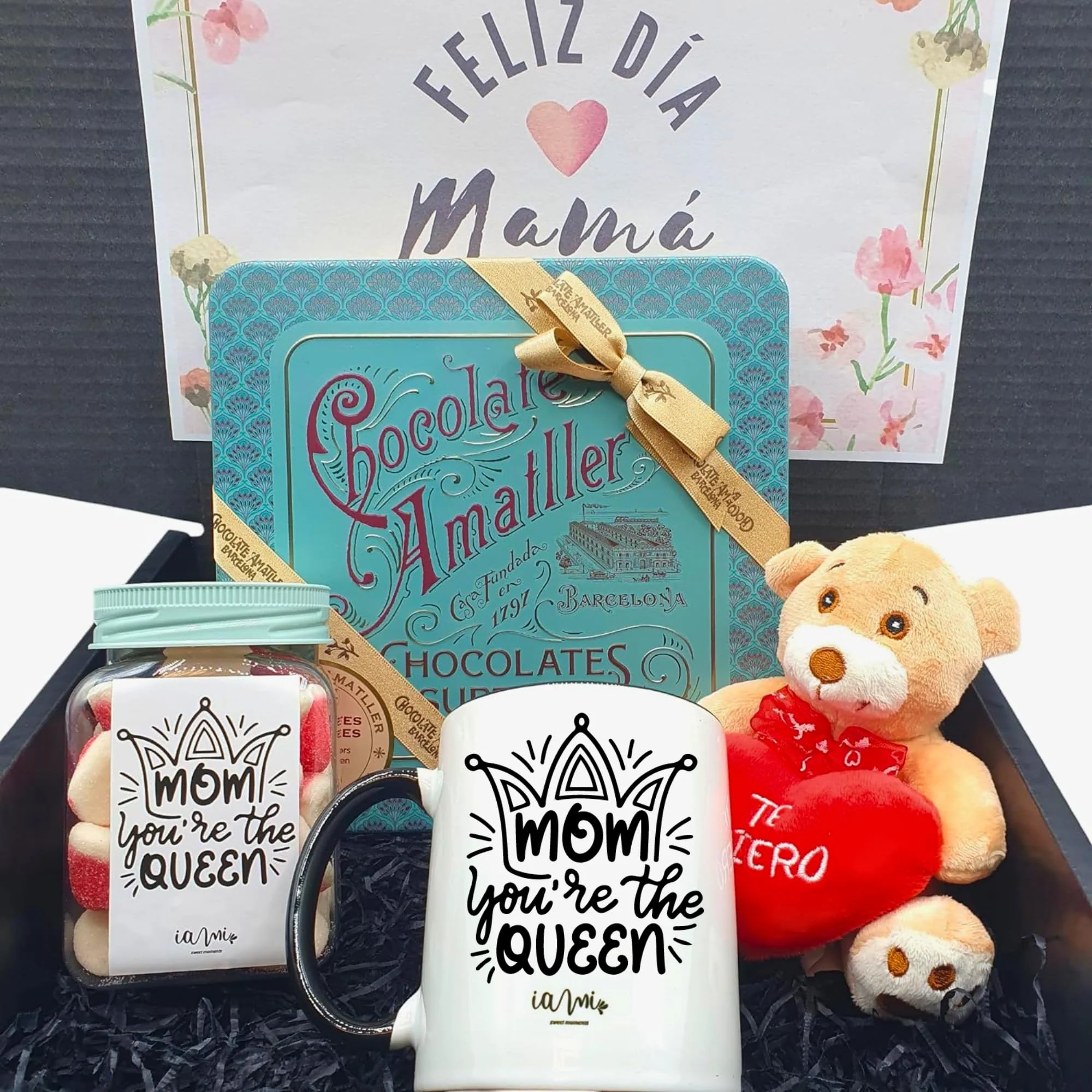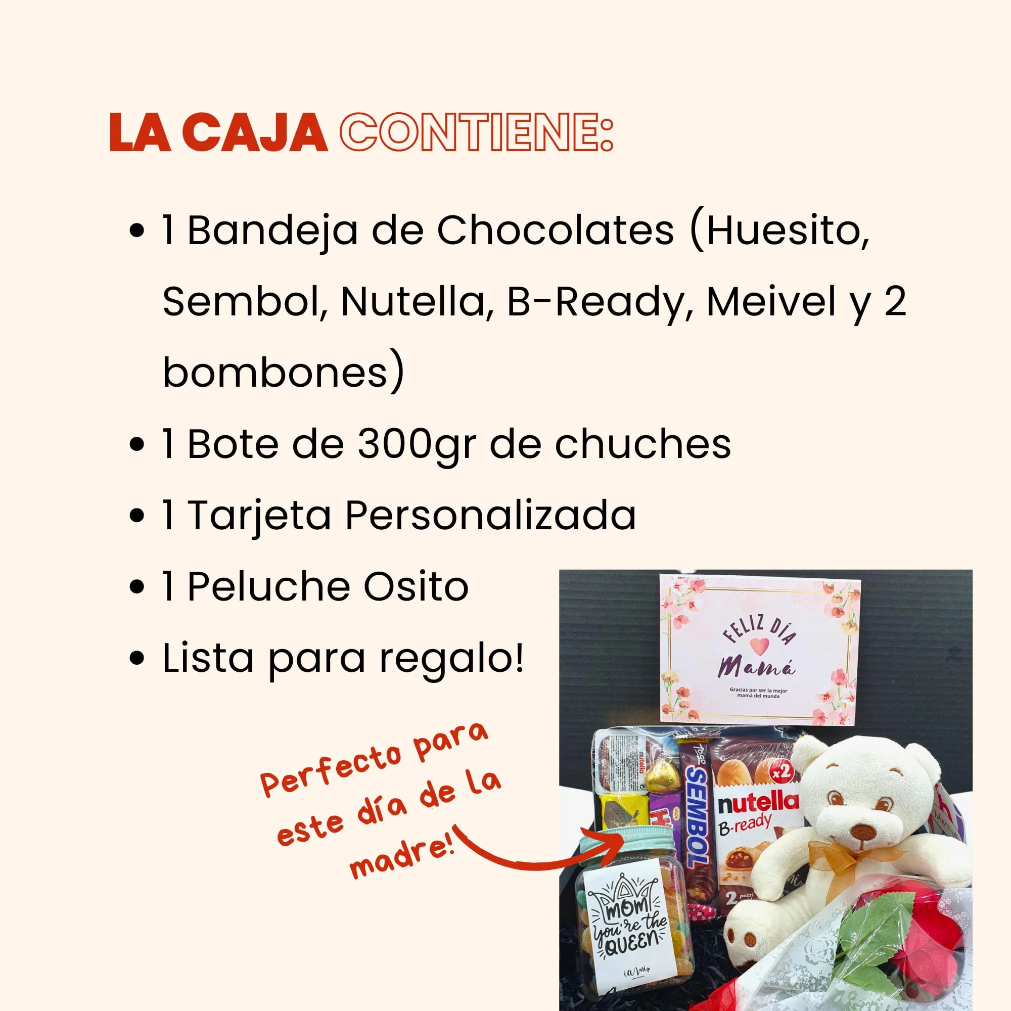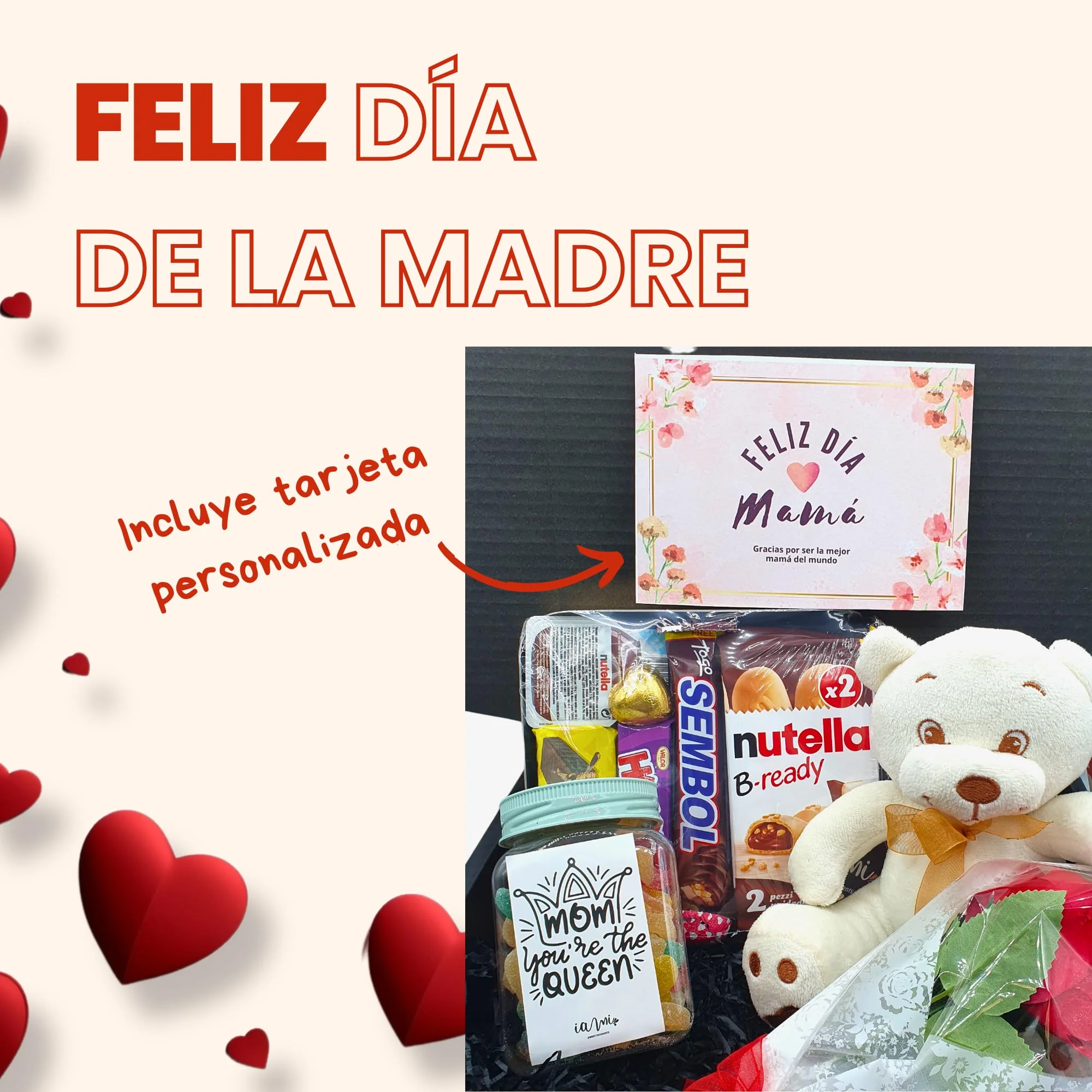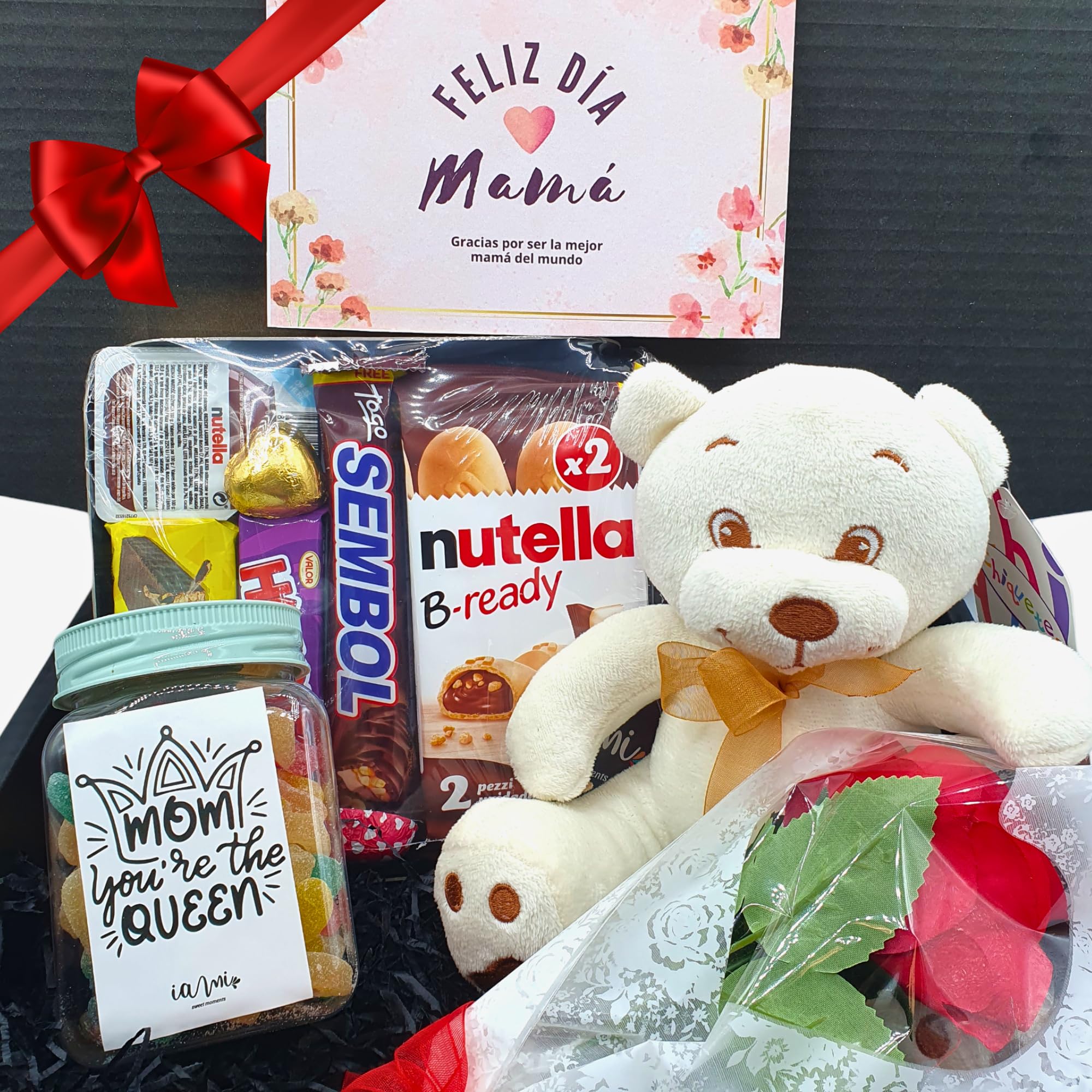 ¡Celebra a mamá con nuestro pack de regalos originales! Incluye una cesta o caja de regalo con bombones en forma de rosa y un tierno peluche. ¡Sorpréndela con estos detalles dulces y cariñosos! (¡Tampoco olvides darle un abrazo!)